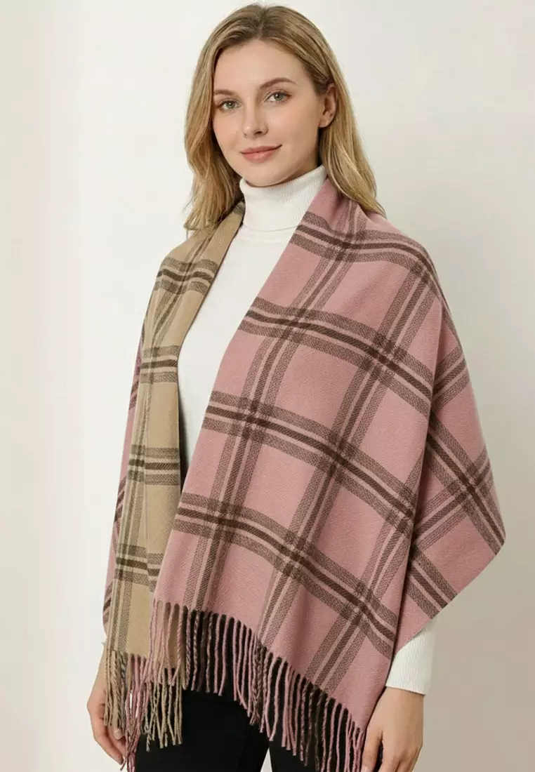 Aksesoris Wanita Double Side Checks Motif Cashmere Pashmina Shawl Syal Wanita Kotak Kotak Pink & Beige