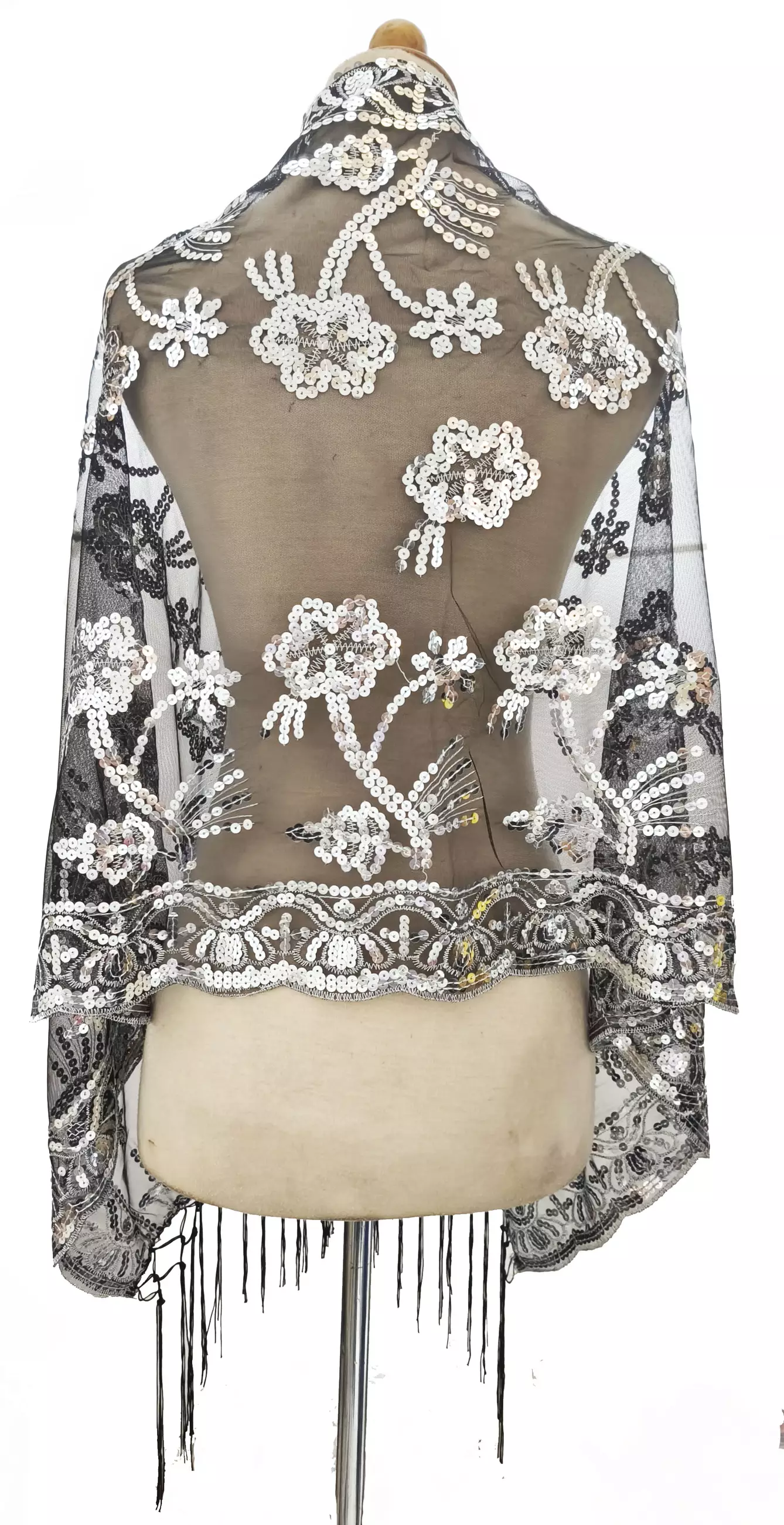 Aksesoris Wanita Flower Rays Sequinn Lace Fringed Evening Shawl Syal Pesta Wanita Black & Silver