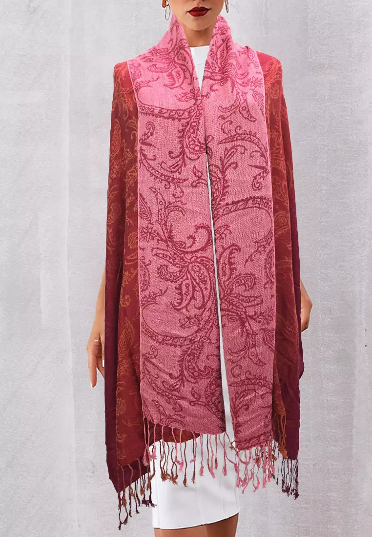 Aksesoris Wanita Gradient Reversible Viscose Floral Pattern Pashmina Shawl Syal Gradasi Wanita Maroon & Red