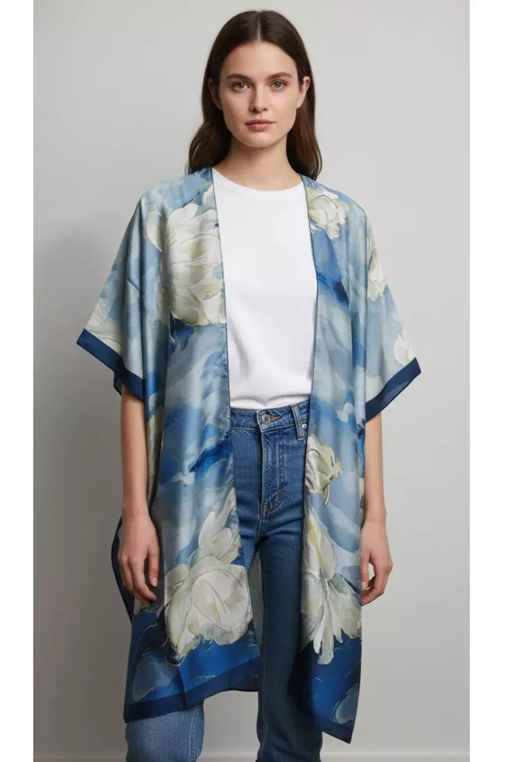 Aksesoris Wanita Magnolia Print Outer Syal Wanita Sky Blue