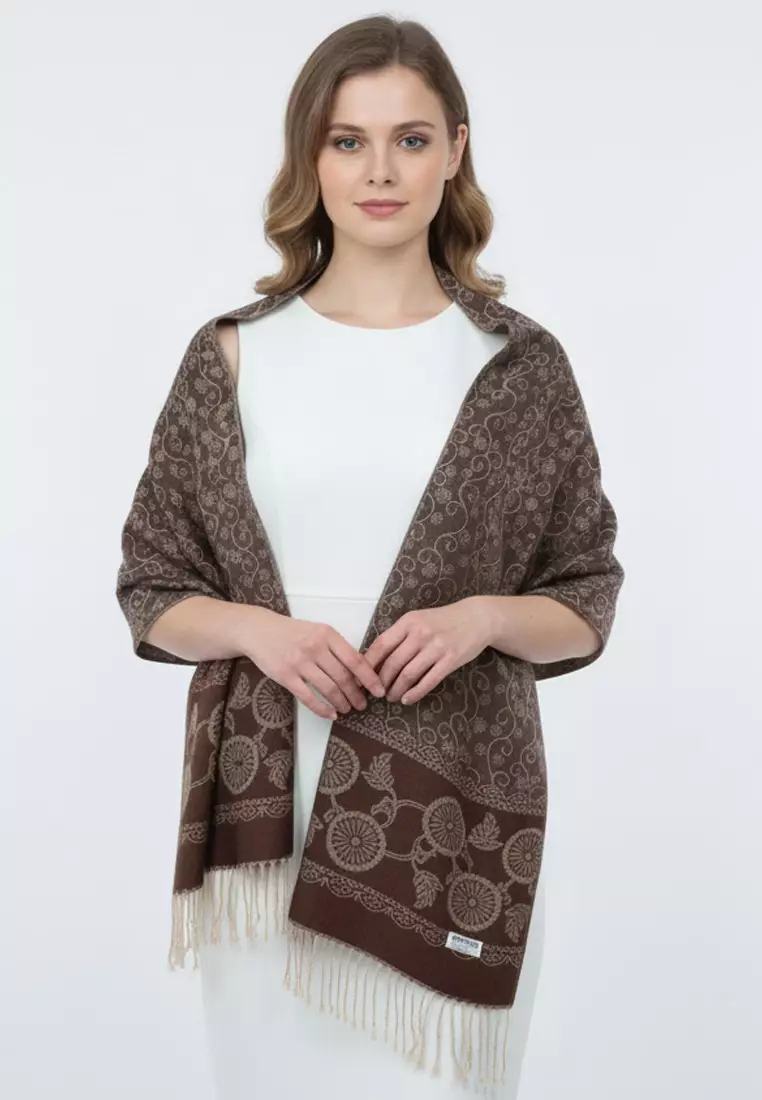 Aksesoris Wanita Reversible Viscose Circular Vine Pattern Pashmina Shawl Syal Wanita Brown