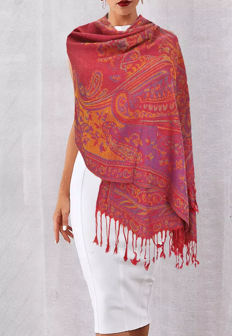 Aksesoris Wanita Reversible Viscose Full Paisley Pattern Pashmina Shawl Syal Wanita Ruby Sunset