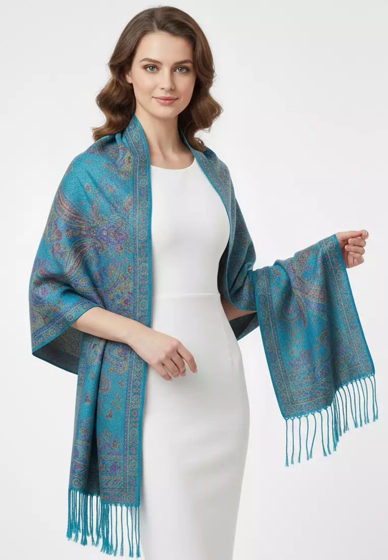 Aksesoris Wanita Reversible Viscose Full Paisley Pattern Pashmina Shawl Syal Wanita Teal Blossom