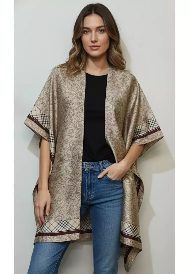 Aksesoris Wanita Roses Checks Border Print Outer Syal Wanita Beige