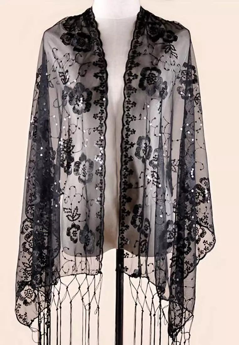 Aksesoris Wanita Small Flower Sequinn Lace Fringed Evening Shawl Syal Pesta Wanita Black
