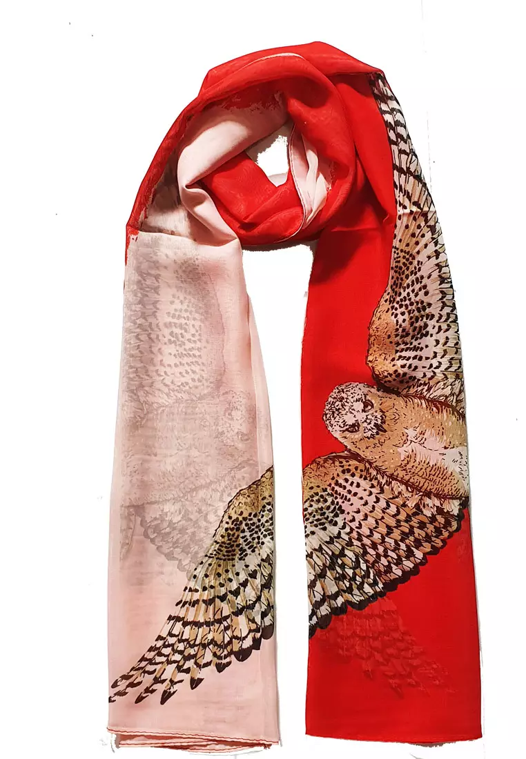 Bohemian Owl Silk-Feel Scarf Red & Pink