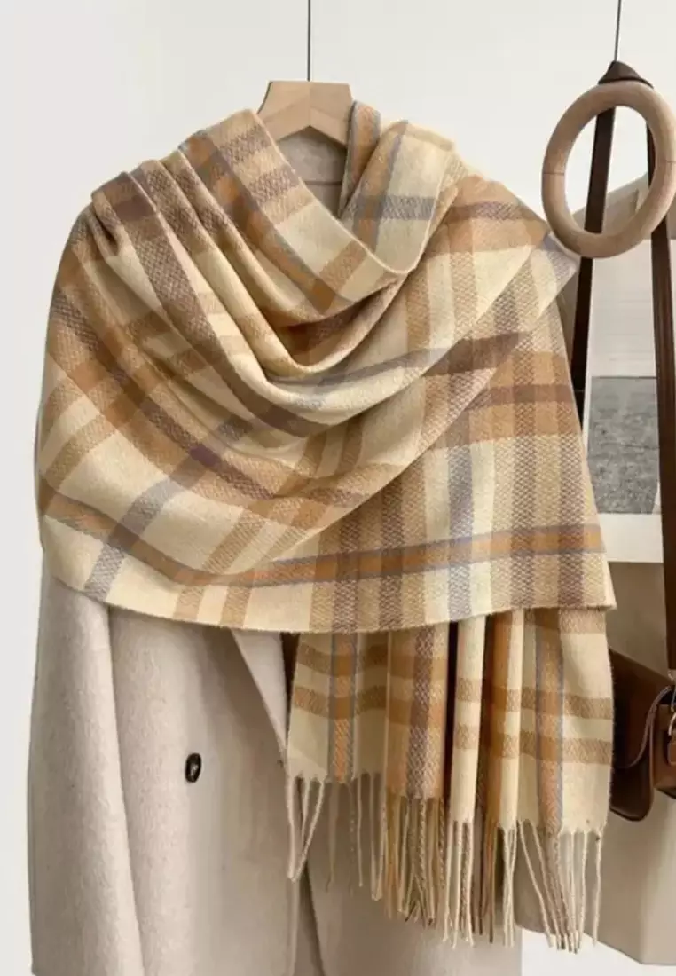 Checkered Cashmere Shawl Bold Lines Syal Wanita Beige Yellow