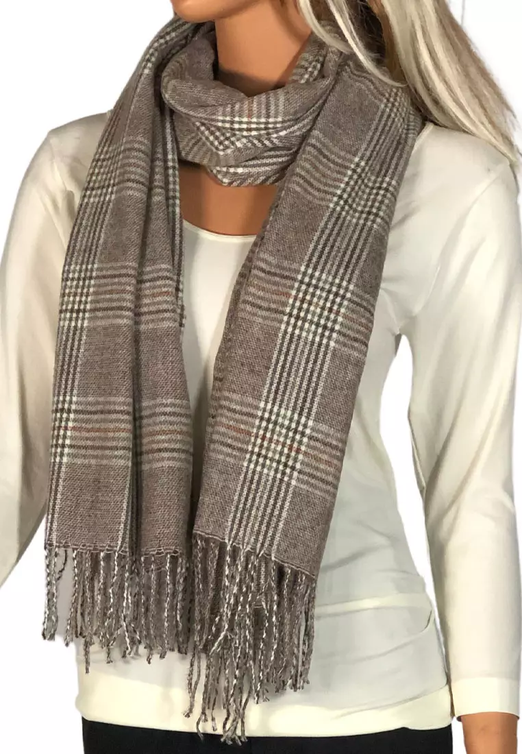 Checkered Cashmere Shawl Mustard Syal Wanita Taupe Brown