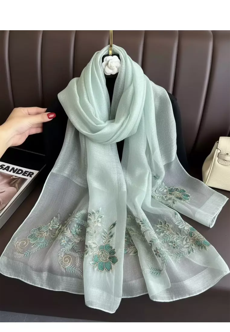 Golden Thread Embroidery Camelia Floral Silk Shawl Syal Sutra Wanita Aqua Marine