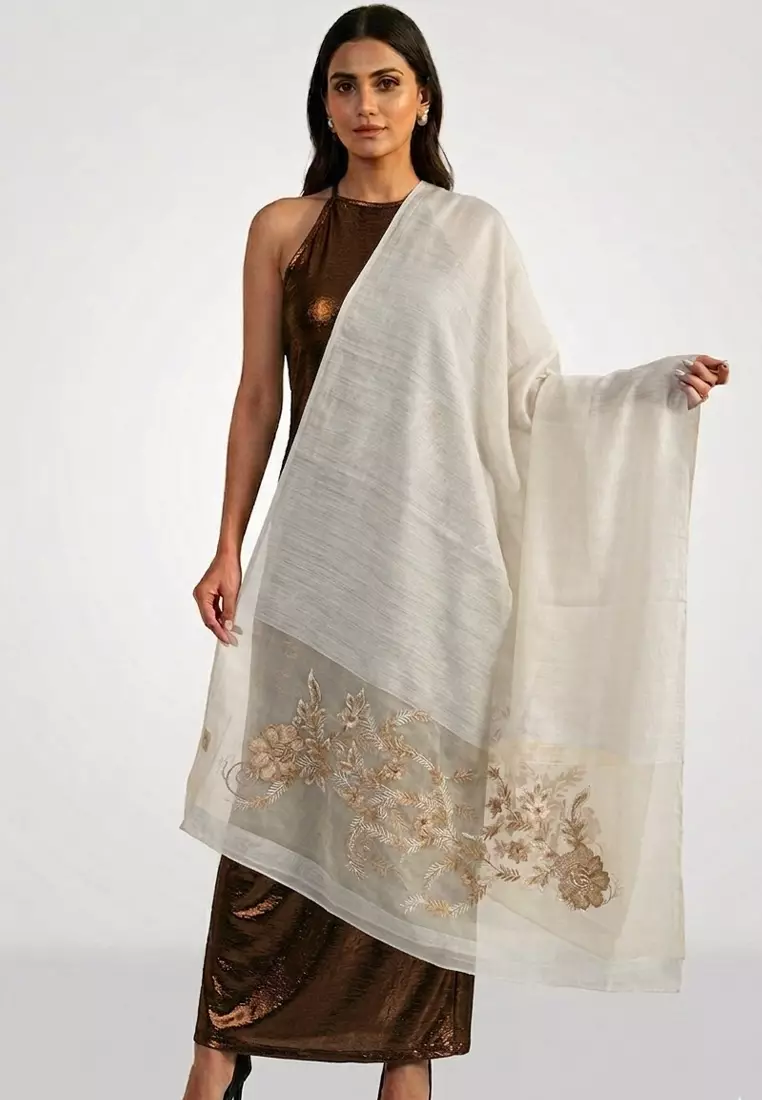 Golden Thread Embroidery Camelia Floral Silk Shawl Syal Sutra Wanita Broken White