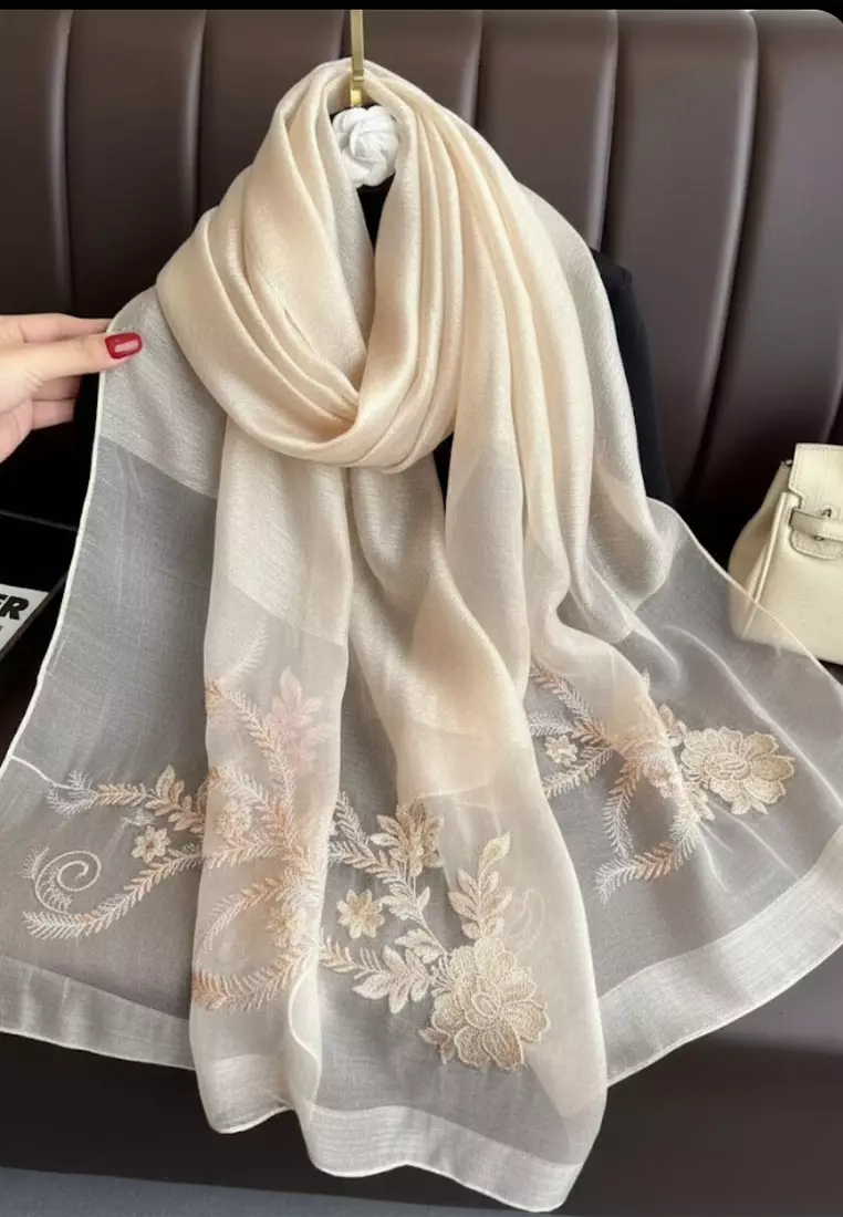 Golden Thread Embroidery Camelia Floral Silk Shawl Syal Sutra Wanita Gold
