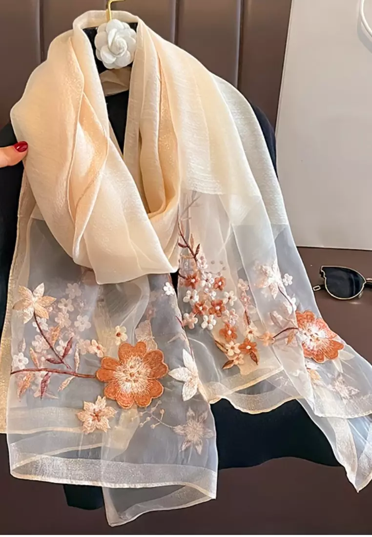 Golden Thread Embroidery Flowery Silk Shawl Syal Sutra Wanita Gold