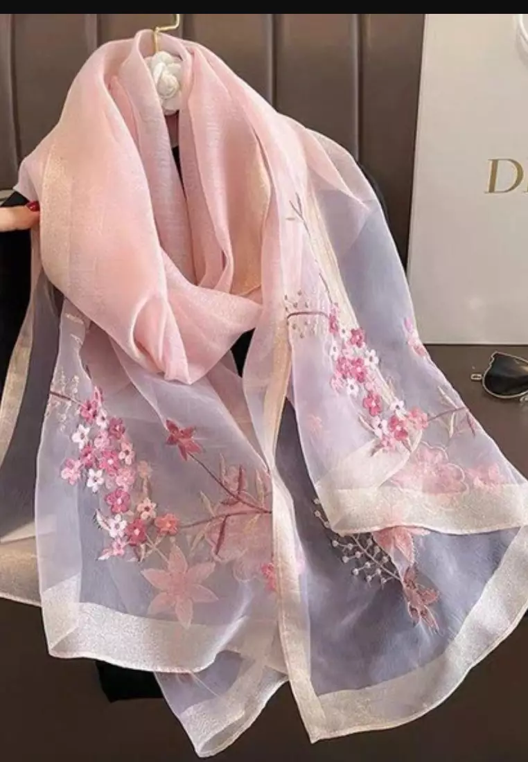 Golden Thread Embroidery Flowery Silk Shawl Syal Sutra Wanita Pink