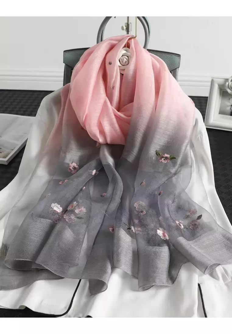 Golden Thread Gradient Embroidery Flowery Silk Shawl Syal Sutra Wanita Pink & Grey