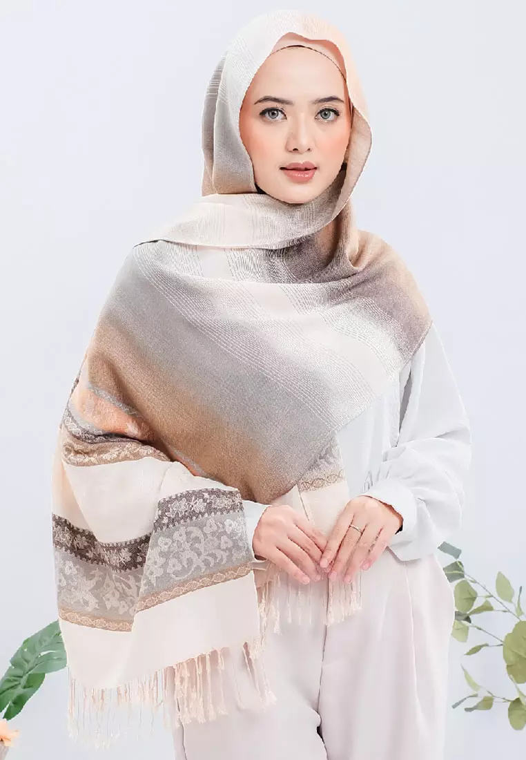 Hijab Pashmina Wanita Reversible Viscose Multicolour Vintage Pattern Pashmina Shawl Syal Wanita Ivory Mist