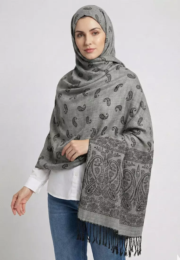 Hijab Pashmina Wanita Reversible Viscose Paisley Pattern Pashmina Shawl Syal Wanita Pebble Grey