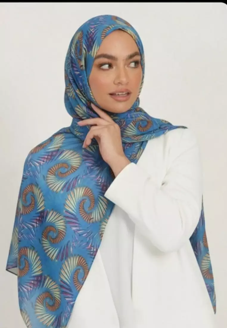 Hijab Printed Wanita Feathery Pattern Poly-Chiffon Blue & Multi