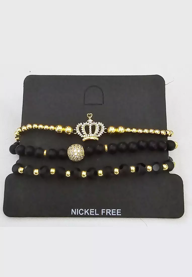 Women's Accessories Jewellery Gelang 3 in 1 Wanita Crown Studded Bangle Set Black & Gold