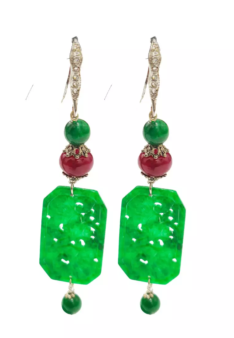 Women's Accessories Ruby Rectangular Jade Earrings Anting Wanita Batu Giok Green