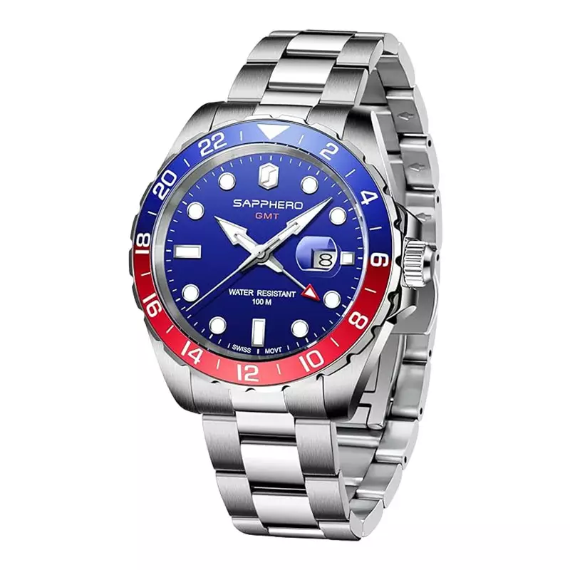 Jam Tangan Pria Sapphero SO-2106-1BLURDBLU GMT Pepsi Blue Dial Stainless Steel Strap Quartz Watch 10 ATM Water Resistant