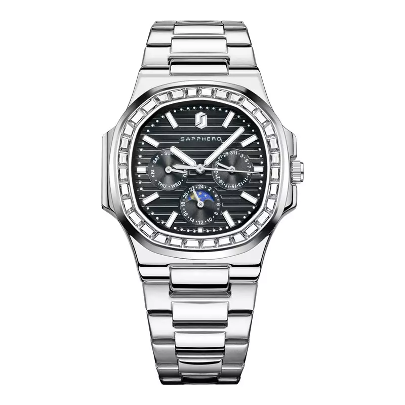 Jam Tangan Pria Sapphero SO-2201-SLVBLK Black Sun & Moon Dial Stainless Steel Strap Quartz Watch 3 ATM Water Resistant
