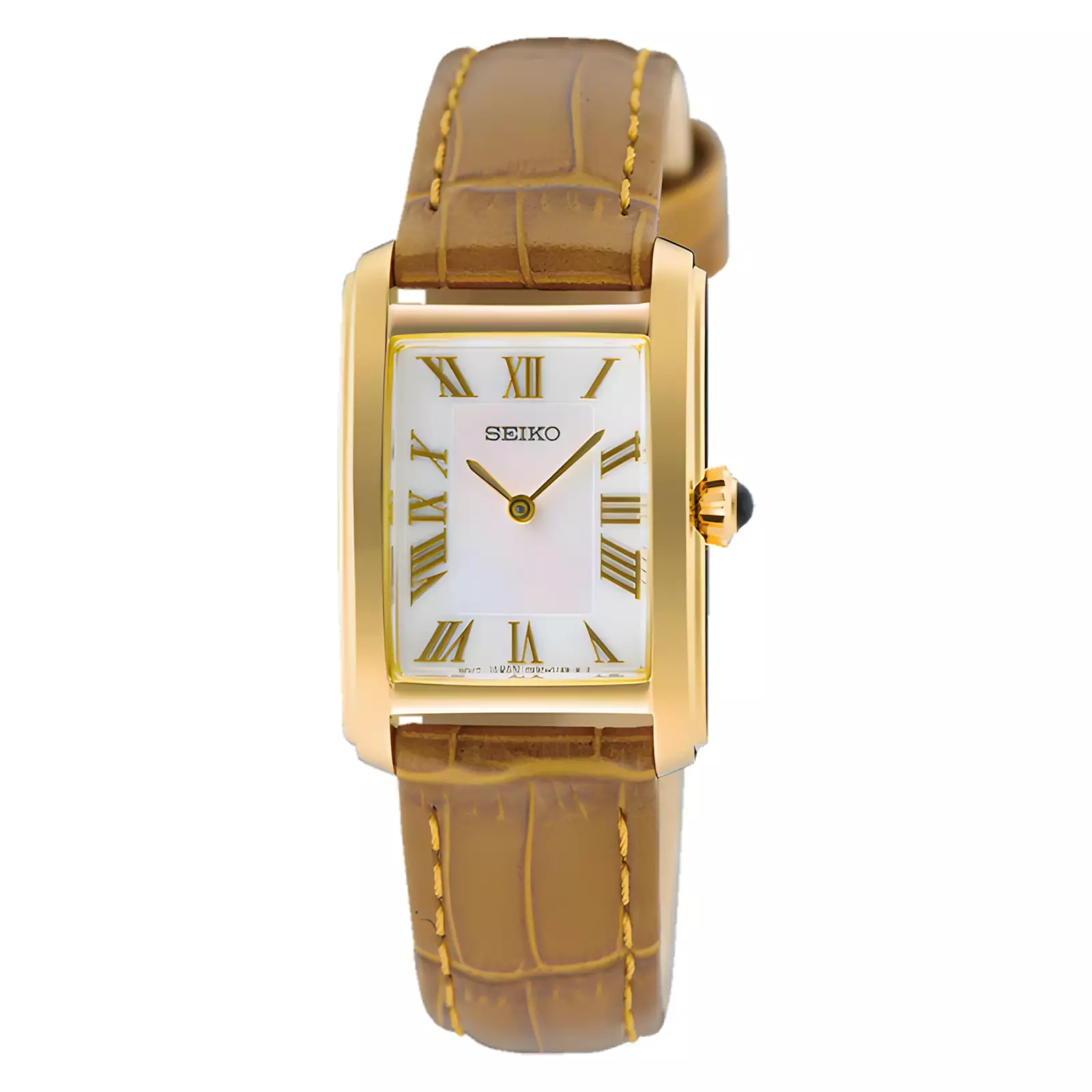 Seiko SWR100P1 - Women's Watch - Jam Tangan Analog Wanita - Classic Quartz Square - Gold Brown - Leather Strap