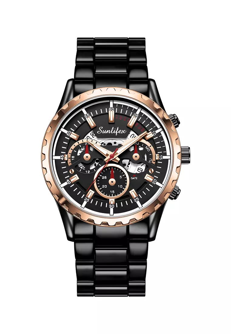 SunlifexJam Tangan Pria 8081 Kuarsa Hollow Design Kalender Tali Stainless Steel Jam Tangan Cowok blackgold480000.00186000.00