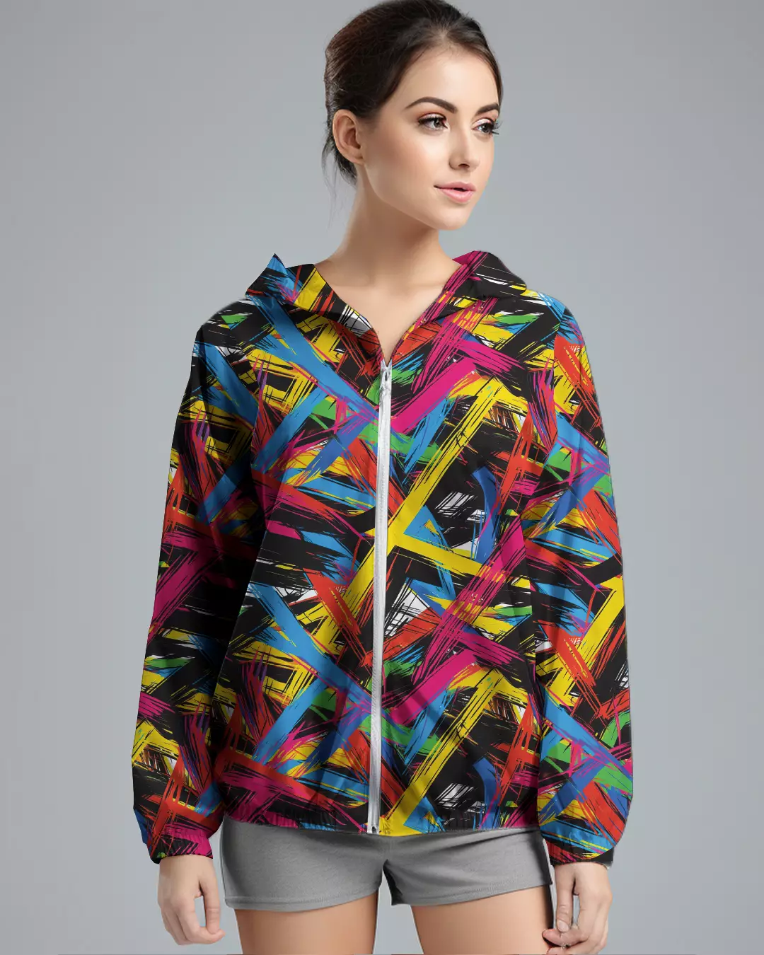 LSD77 Jaket Lari Olahraga Wanita Parasut motif "abstrak cmyk" hitam