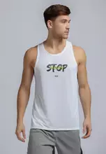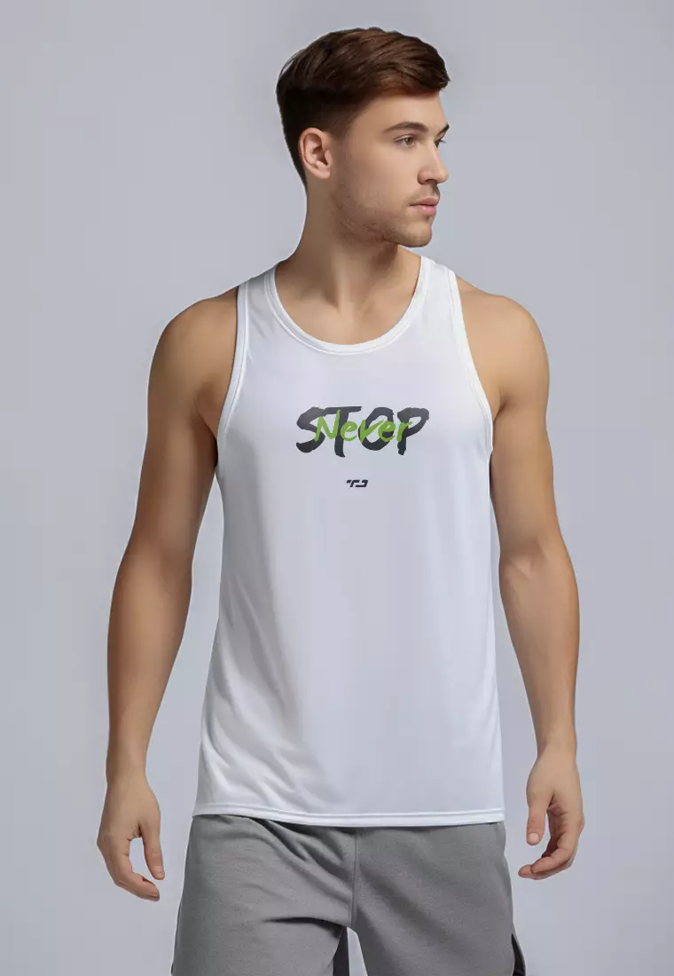MSA79 kaos lari pria kutung tank top nanoamid stretch "never stop" putih