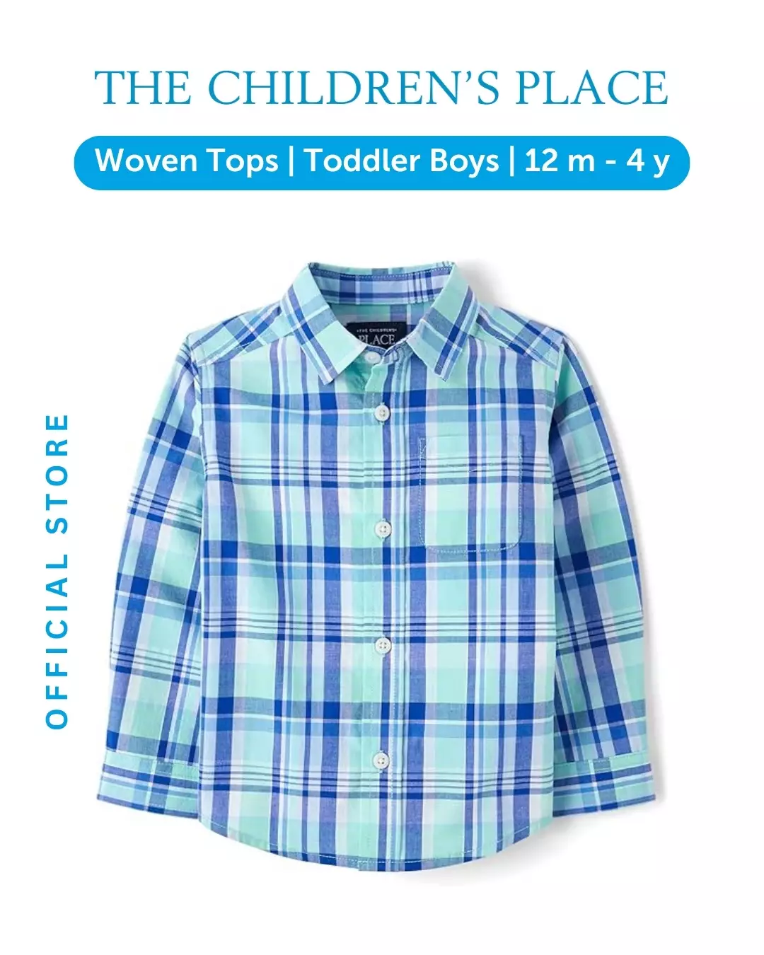 Toddler Boys Plaid Poplin Button Up Shirt - Kemeja Bayi Laki (Biru)