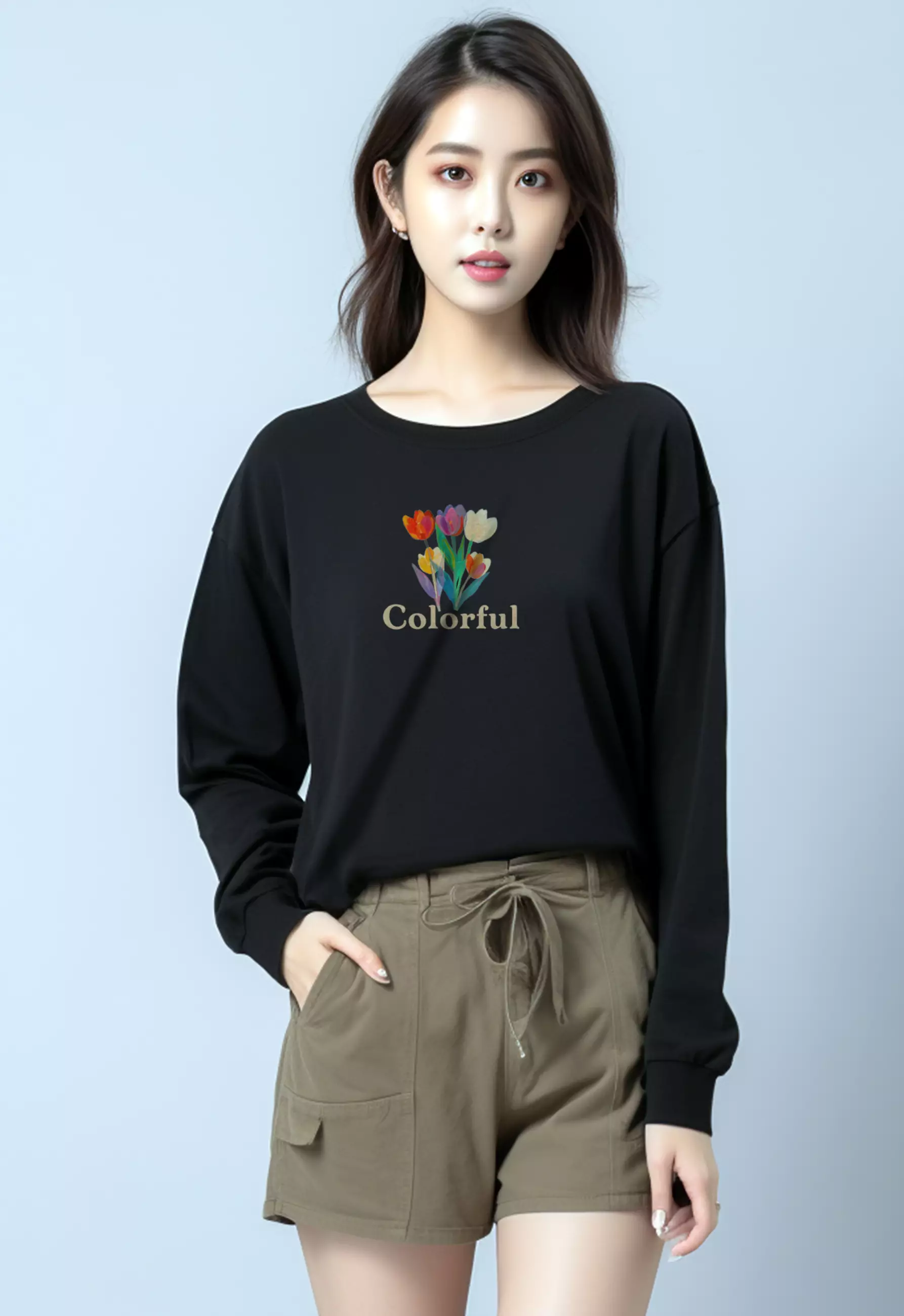 LTF74 Kaos Wanita Gambar Bunga Lengan Panjang "colorful tulip" hitam