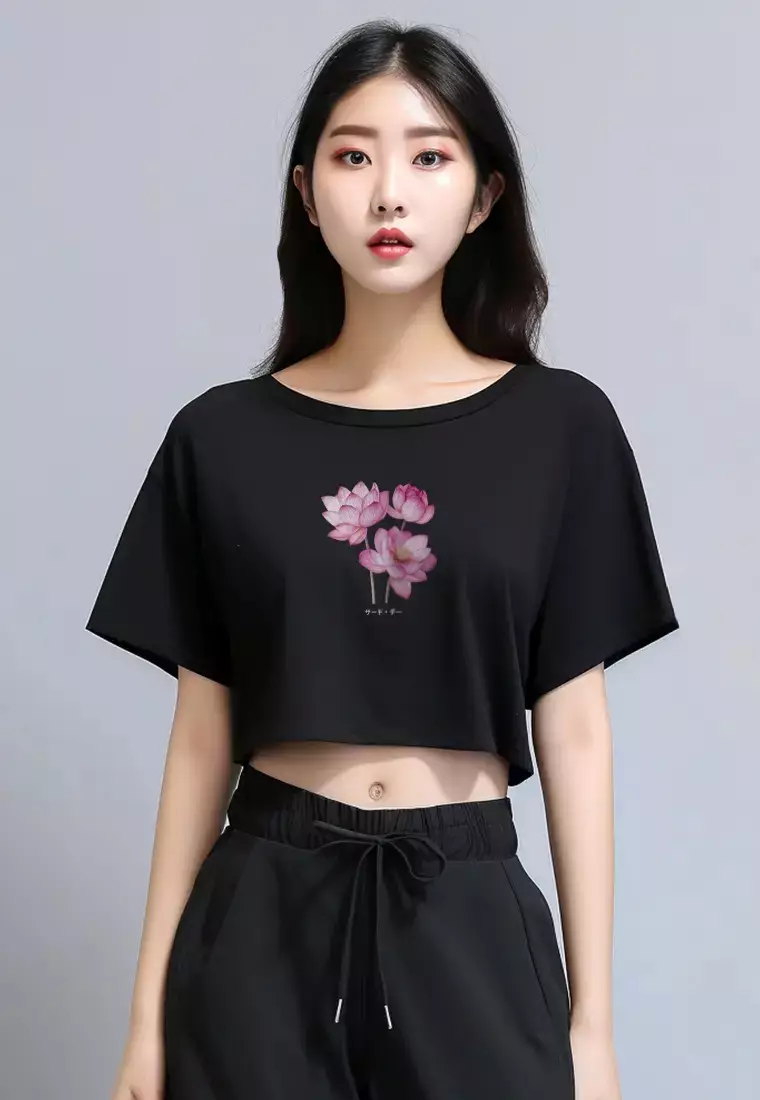 LTG47 Kaos Wanita Gambar Bunga Lotus OLC Crop Oversize Hitam