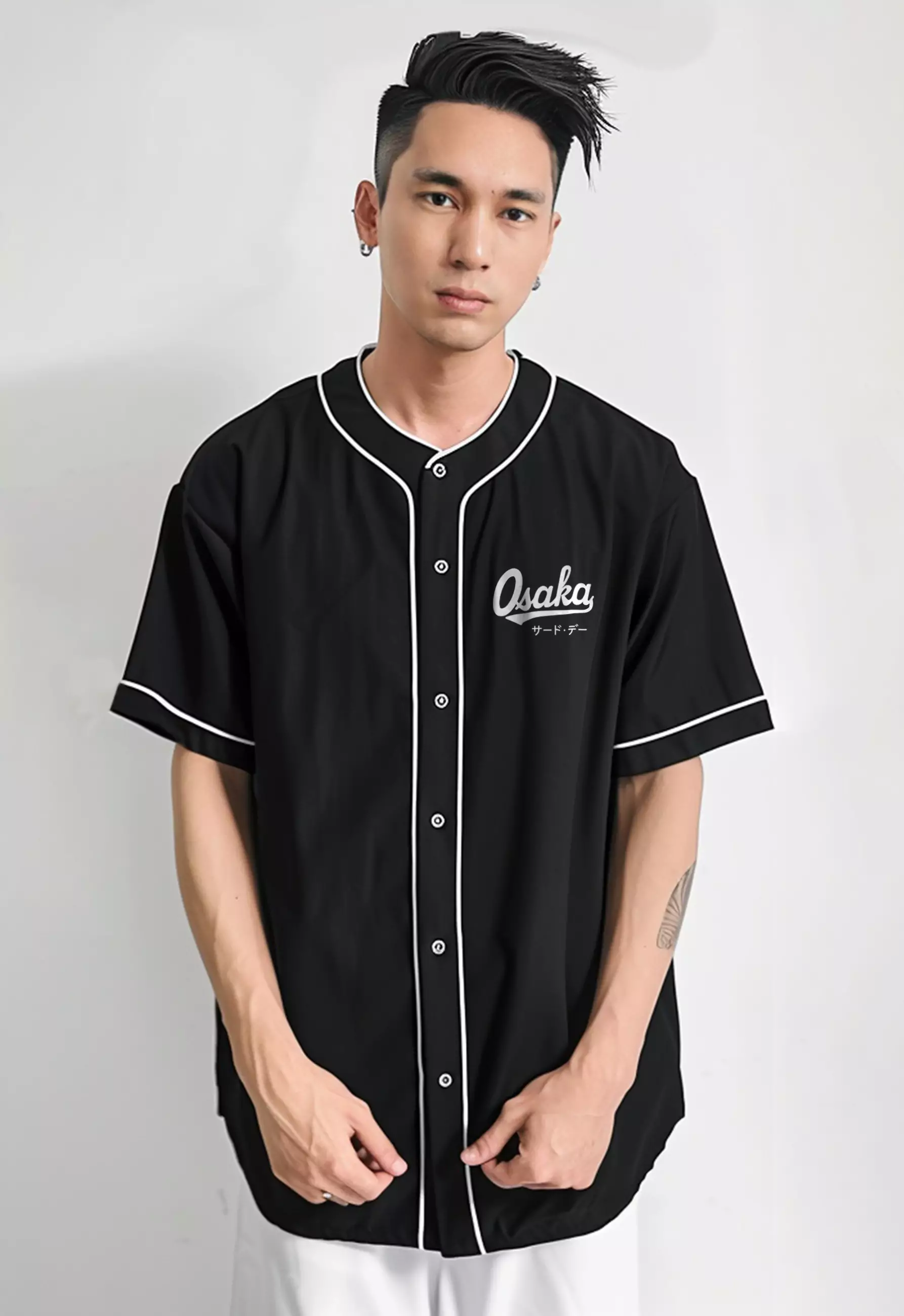 MTS93 Kemeja Baseball Oversize Jersey Polos "Osaka" Hitam