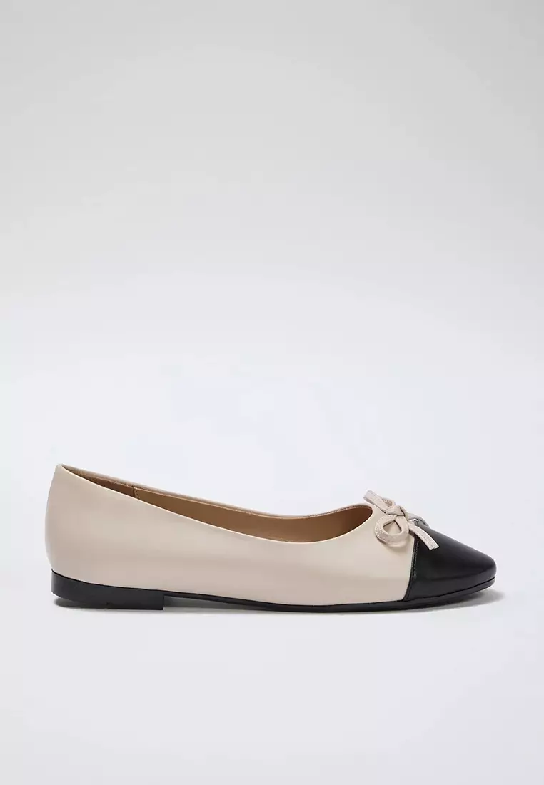 Beige Bow Detailed Color Blocked Almond Toe Women's Ballerinas Takss25Be00000