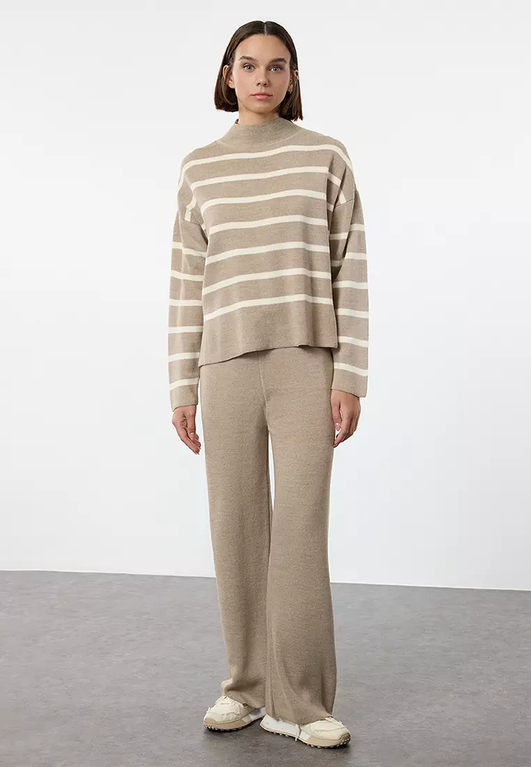 Beige Striped Knitted Trousers Top-Bottom Set TWOAW24AU00045