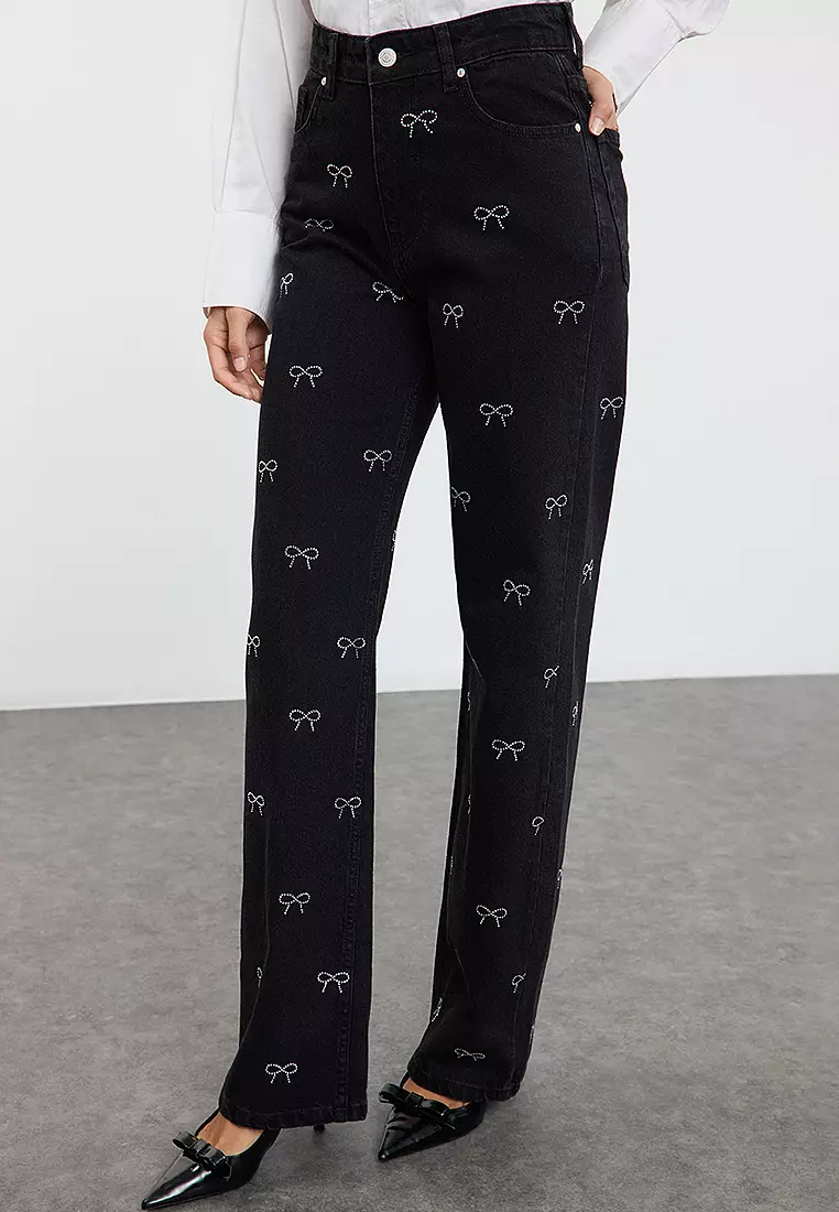 TrendyolBlack Bow/Ribbon Detailed Stoned High Waist Wide Leg Jeans919000.00