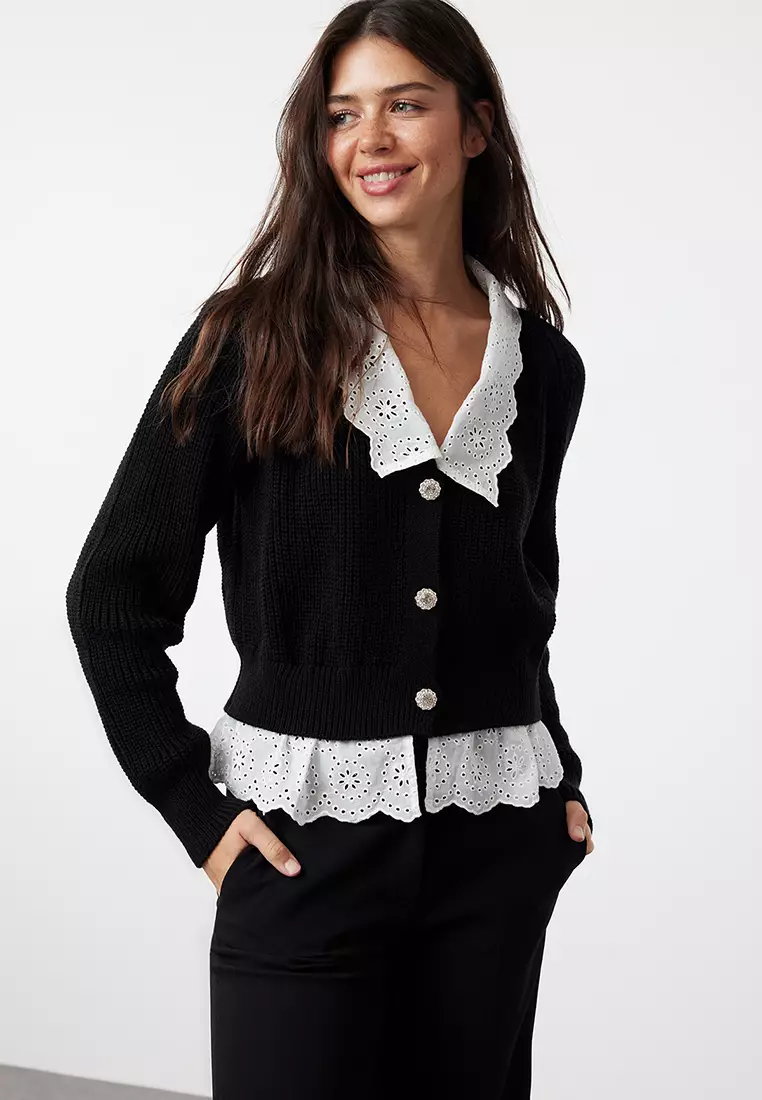 Black Crop Woven Garni Detailed V Neck Knitwear Cardigan TWOAW24HI00221