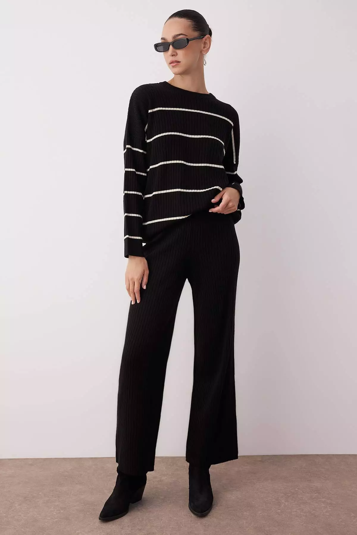 Black Wide Fit Striped Basic Ribbed Knitwear Bottom Top Set
