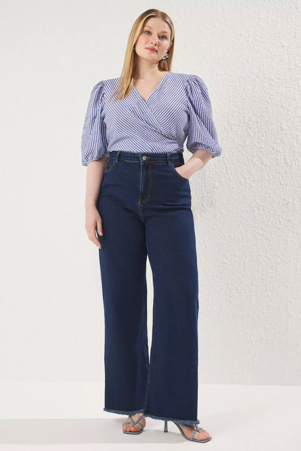 TrendyolDark Blue High Waisted Piercing Detail Wide Leg Comfort Plus Size Wide Leg Jeans Tbbss23Cj00009779000.00