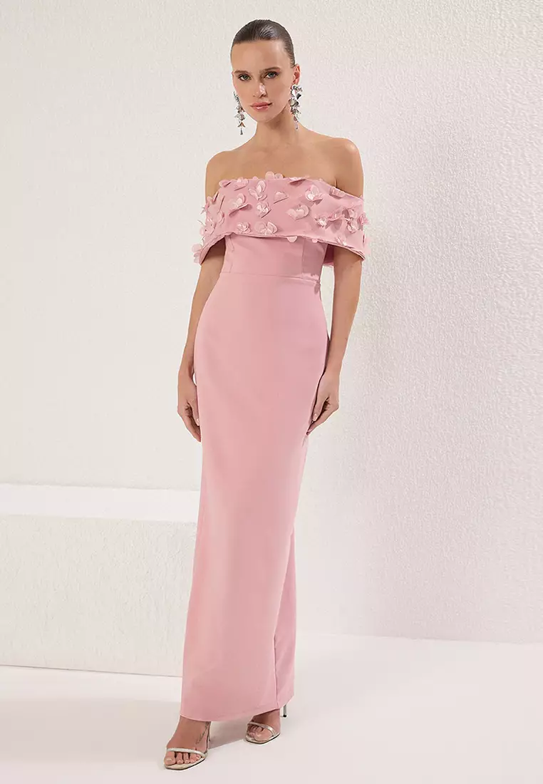 TrendyolDusty Rose Carmen Collar Flower Applique Detailed Woven Long Evening Night Graduation Dress TPRSS25AE00107739000.00