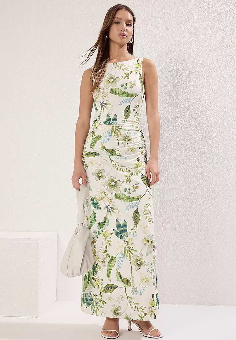 TrendyolEcru Floral Printed Shiny Surface Boat Neck Flexible Knitted Pencil Dress599000.00