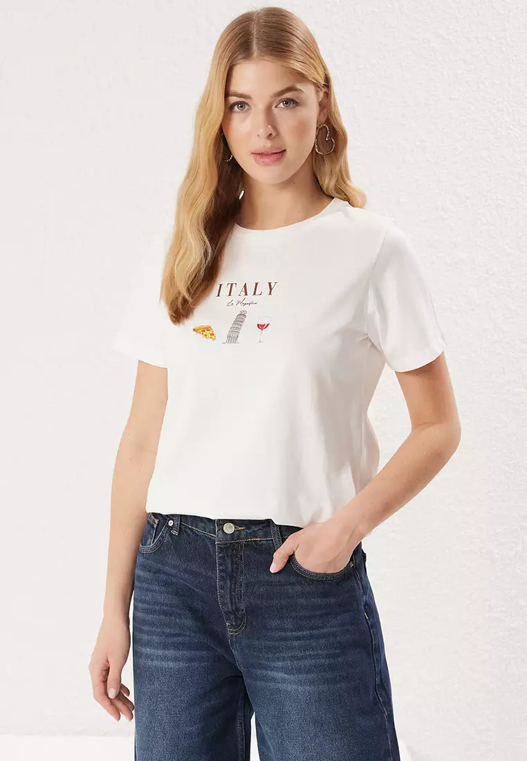 Ekru 100% Cotton Regular Fit Slogan Printed Knitted T-Shirt TWOSS25TS00047