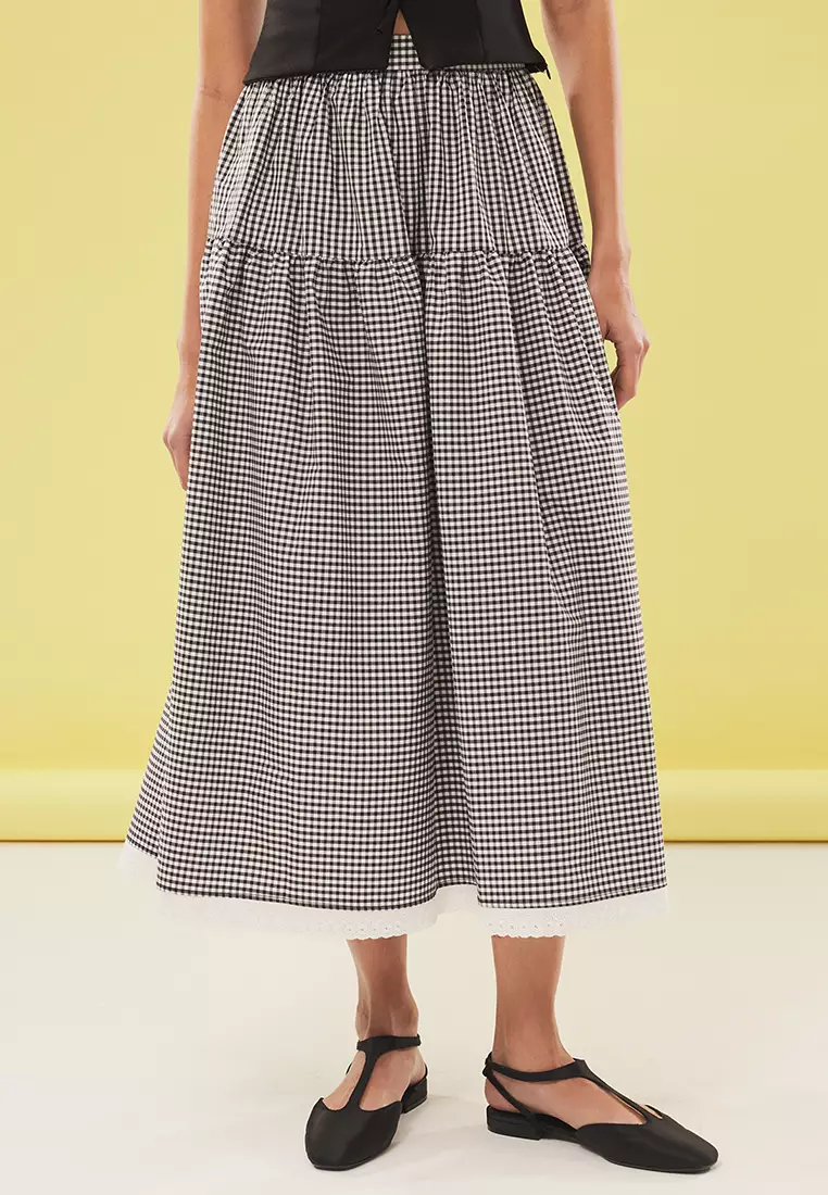 Gingham Pattern Lace Detailed A-line Midi Skirt