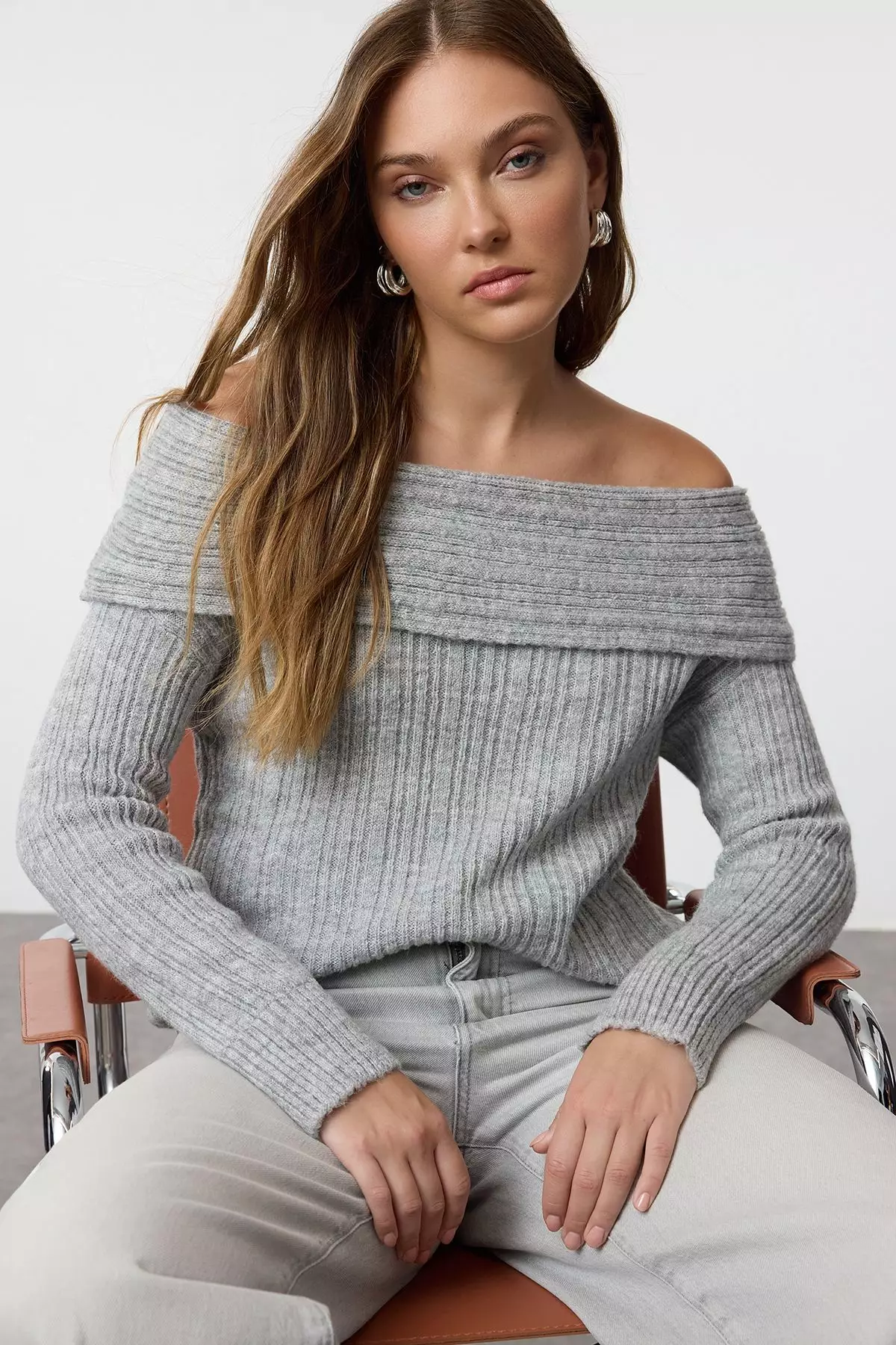 TrendyolGray Soft Texture Carmen Collar Knitwear Sweater TWOAW25KZ000761089000.00577150.00