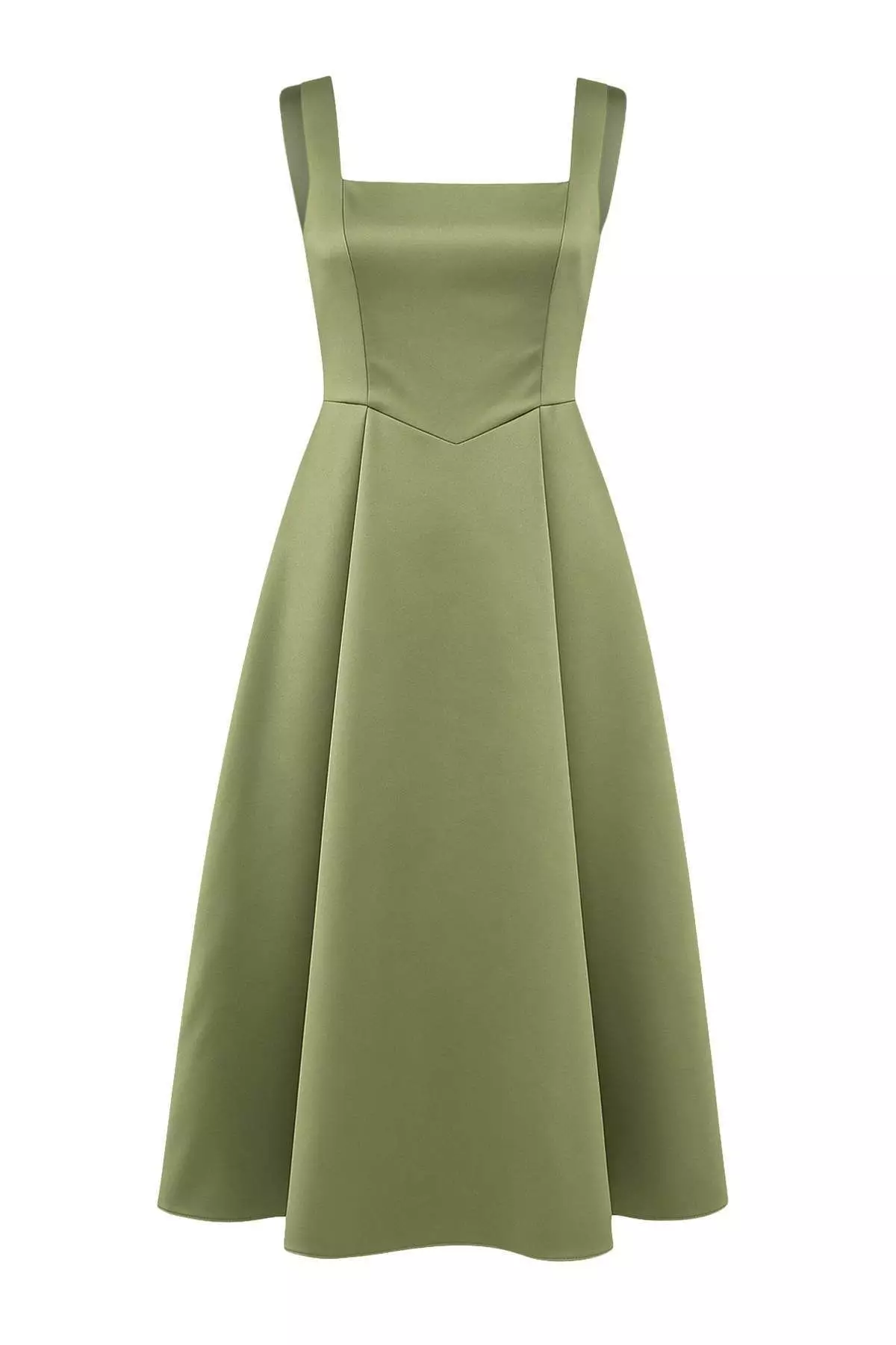 Oil Green Skirt Waist Open Woven Satin Midi Unlined Homecoming/Prom Dress