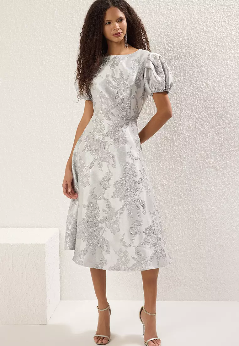 Silver A-Line Jacquard Woven Midi Chic Dress