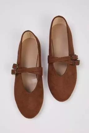Tan Cross Strap Suede Almond Toe Mary Jane Ballerinas Takeaw26Be00006