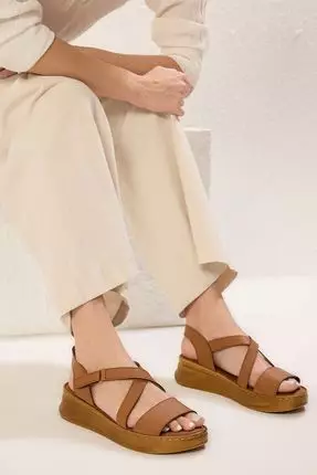 Tan Cross Velcro Straps Extra Comfortable Flat Women's Sandals Takss25Sd00000