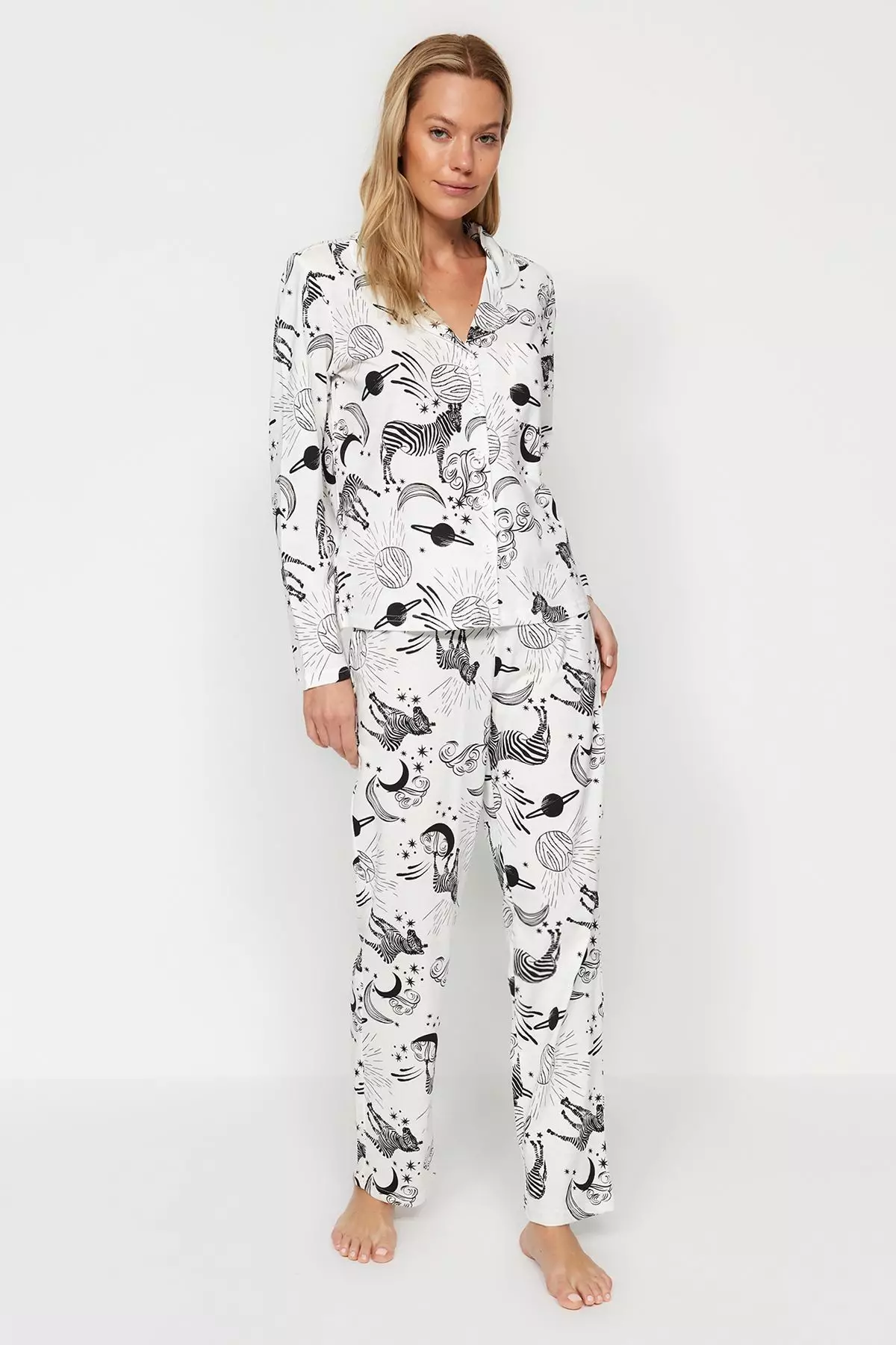 TrendyolWhite 100% Cotton Patterned Shirt-Pants Knitted Pajama Set THMAW24PT00002489000.00440100.00