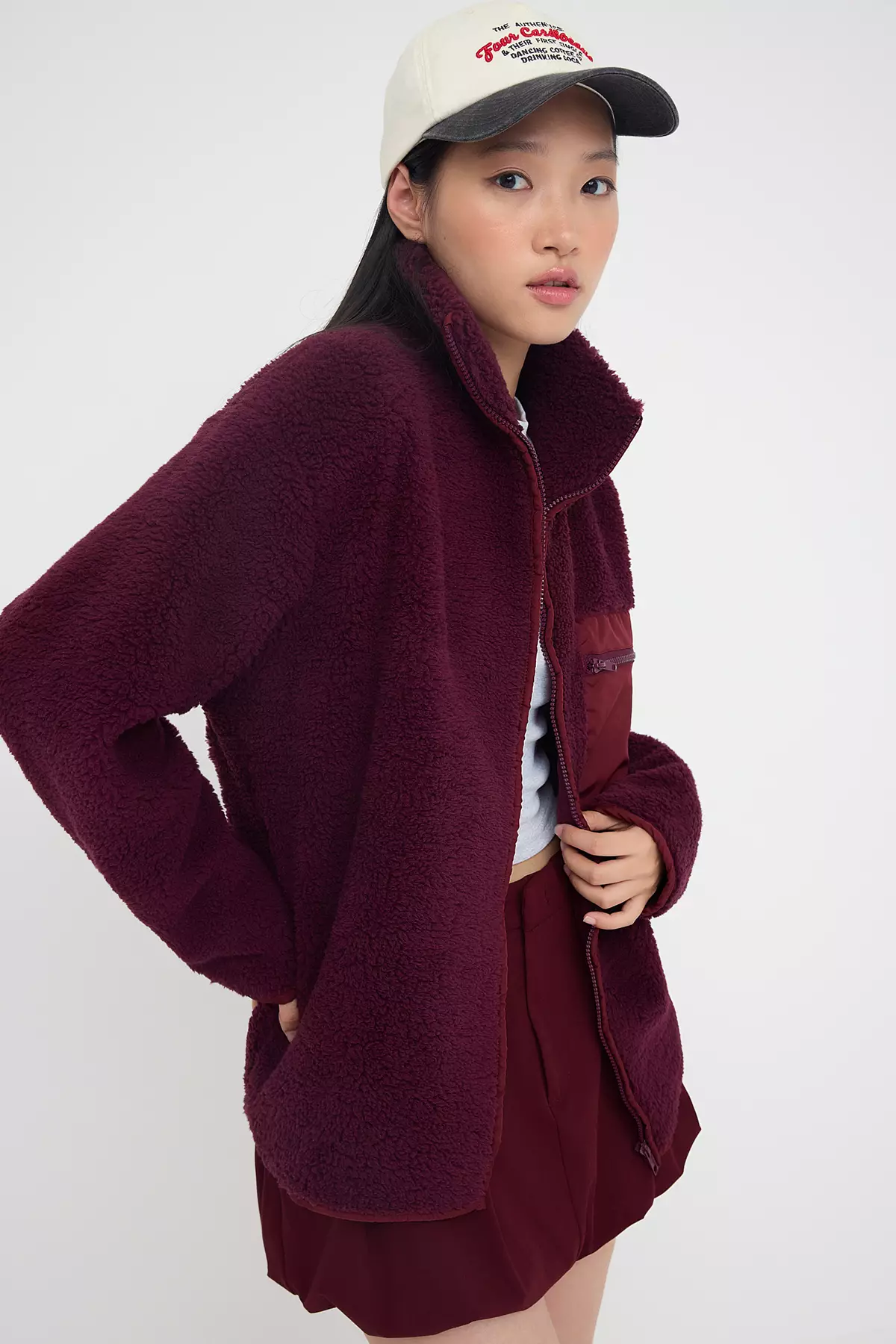 Winter Essentials Plum Fleece Zippered Stand-Up Collar Pocket Detailed Knitted Sweatshirt Twoaw24Sw00071